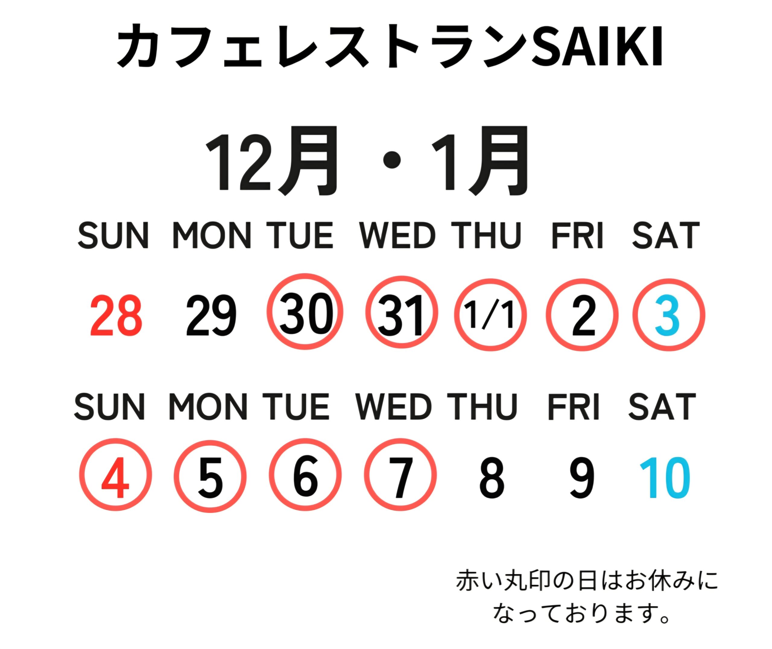 いつもご来店いただきまして 誠にありがとうございます。 年末年始のお休みのお知らせです。 年末年始のお休みは 12月30日(火)〜1月7日(水)となります。 ご来店予定のお客様にはご不便をおかけいたします。 営業開始は1月8日(木)からです。 来年もSAIKIでのお食事をお楽しみください 皆様のご来店を心よりお待ちしております❗
