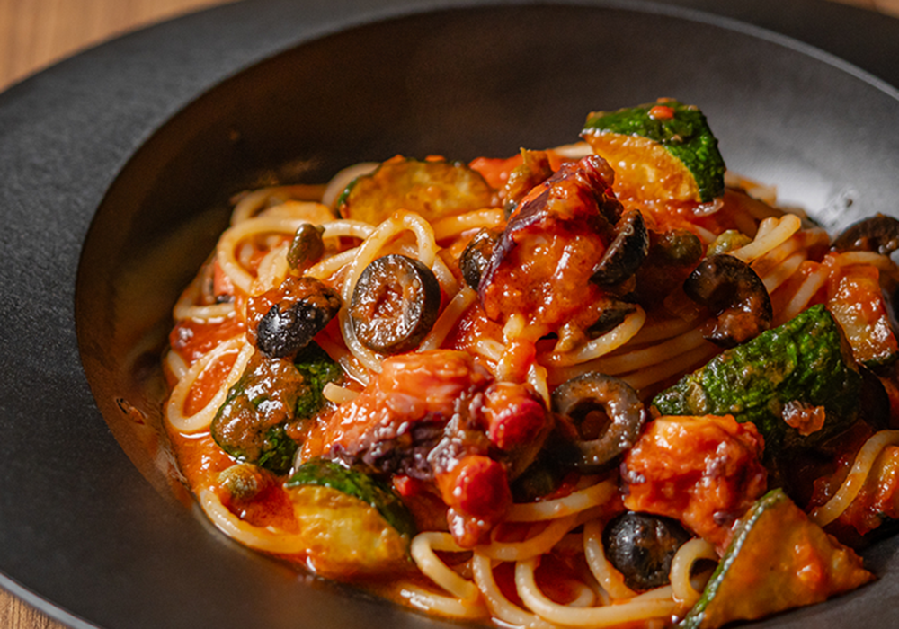ふんわり柔らかく煮込んだタコがゴロッと。オリーブとケッパーが入ってプッタネスカ風に仕上げてます。